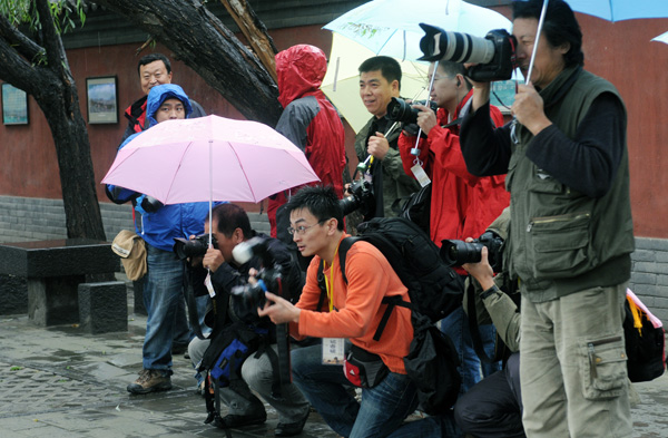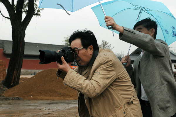 ? ?参加新闻摄影名家聚焦“中国古都——大同”的记者冒雨拍摄大同市新复建的文化旅游景点。