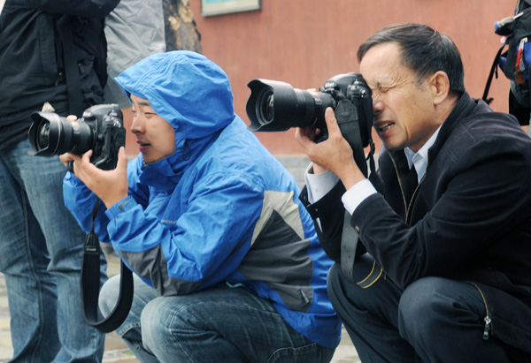 中国新闻摄影学会副主席、新华社研究员胡颖(左)冒雨抓拍。
