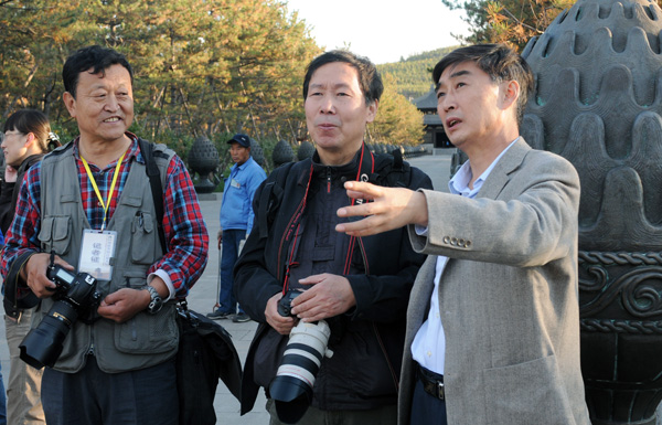 大同市副市长冀明德(左),中国新闻摄影学会副主席胡颖、江志顺将军,和大同市有关领导为采风开镜。