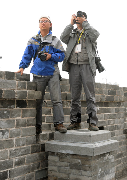参加新闻摄影名家聚焦“中国古都——大同”的记者爬到高处拍摄新修复的城墙。