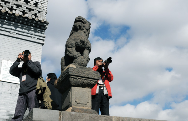参加新闻摄影名家聚焦“中国古都——大同”的记者登高拍摄大同市发展绿色生态旅游的镜头。