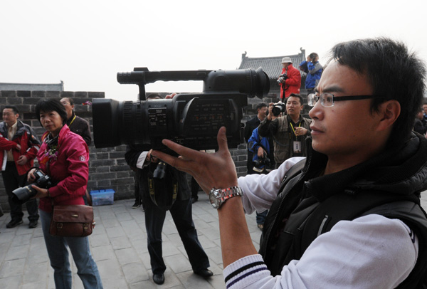 网络媒体视频记者在大同市新复建的长城上拍摄。