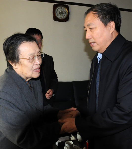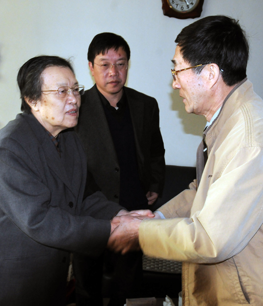 中国新闻摄影学会执行主席赵德润(右)前往范敬宜同志家中吊唁,对范敬宜夫人吴秀琴及子女表示亲切慰问