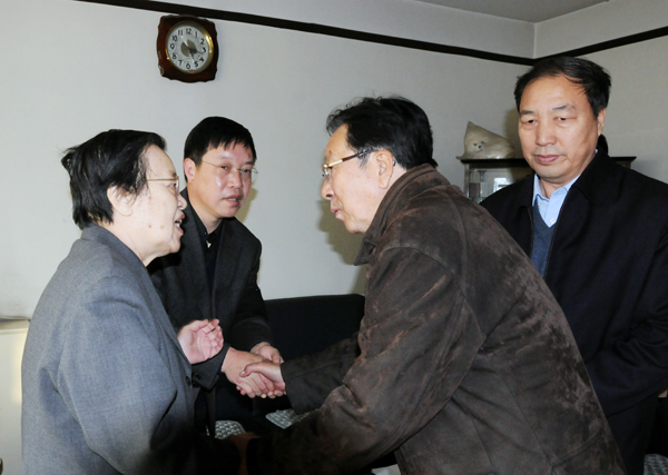 中国新闻摄影学会主席于宁(右)前往范敬宜同志家中吊唁,对范敬宜夫人吴秀琴及子女表示亲切慰问