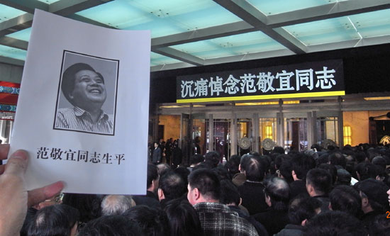 参加范敬宜先生的遗体告别仪式的群众展示范敬宜先生的生平照片。