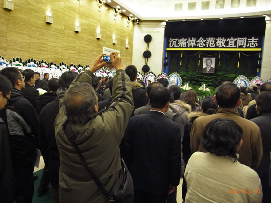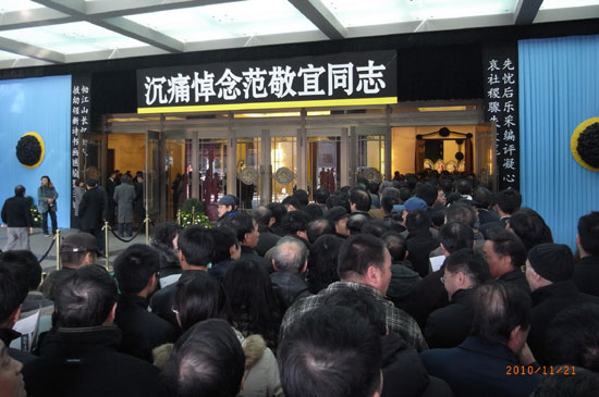 范敬宜先生的遗体告别仪式灵堂大门外排满了前吊唁的群众。