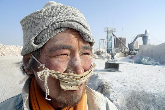 这位工人用一缕布条当做口罩抵挡扑入鼻口的粉尘。