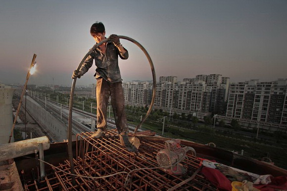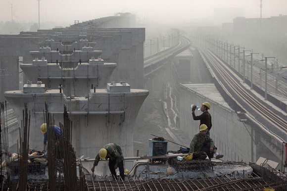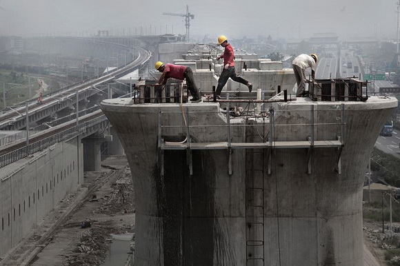 ??? 高铁工人在29米高的墩身上浇筑垫石,为了使梁板在墩与墩之间的结合平稳、对应,各墩身间的高低误差不能超过5毫米,这个误差通过墩身顶部的两块垫石来调节。
