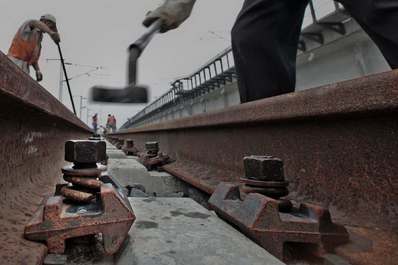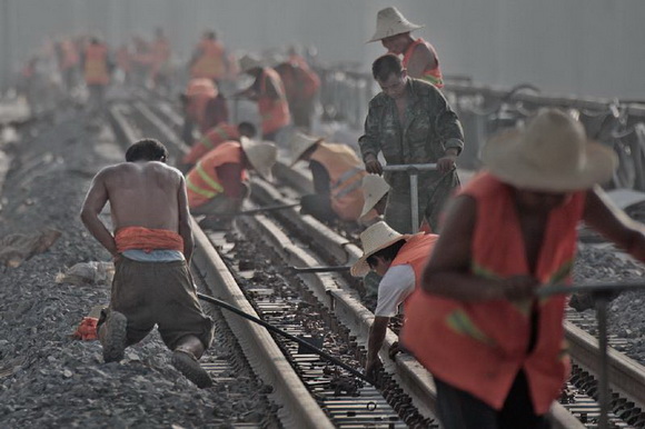 工人们在高铁有渣轨路段作业。