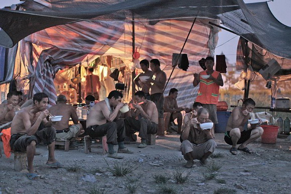 高铁工人们在住处吃饭。