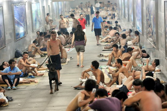 ???2010年8月5日,中国武汉武昌岳家嘴地下通道,挤满前来避暑的农民工,有三四百人之多。据了解,这些农民工来自周边工地。由于工棚闷热,不通风,没有好的居住环境,这些农民工只好借宿城市的地下通道。