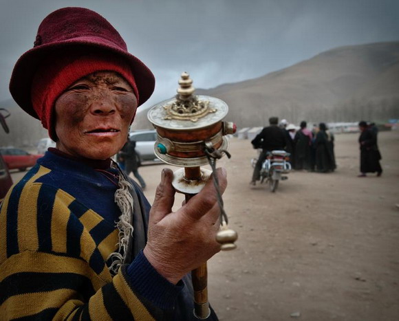 玉树赛马场一位手摇转经的藏民