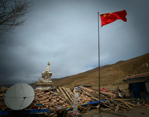 ??? 2010年4月14日,中国青海省玉树县发生里氏7.1级地震,两千多名同胞遇难。震后在这个以藏族同胞为主体居民的高原县城,随处可见幸存者在抢救佛器,他们裹着佛雕,抱着莲花,扶起倒下的神像。玉树的藏民并不认为死亡是与生者的诀别,在他们看来,那就像藏传佛教的转经筒一样旋转不停,在生命的六道轮回里,只是下一次生死轮回的起点。对生的信仰就像不倒的格萨尔王像,历经劫难却依然屹立在广场中央;与藏传佛教的佛塔同样挺拔的还有那面鲜艳的五星红旗,它寄托着这个国家与13亿同胞对玉树的希望。玉树对生的信仰感动着高原的天地,愿天佑玉树。