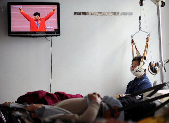 ??? 2010年11月25日,浙江嘉兴市中医院理疗室里,几名患者正在做牵引理疗。当天,悬挂在病房中的电视机,正在转播广州亚运赛事。在男子110米栏决赛中,中国飞人刘翔以13秒09的赛季个人最好成绩夺得冠军,不仅连续第三次打破了赛会纪录,并且成为亚运会历史上第一位三夺110米栏冠军的选手。此刻,13亿国人悬挂的心终于放下了。