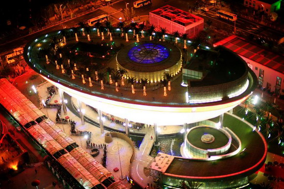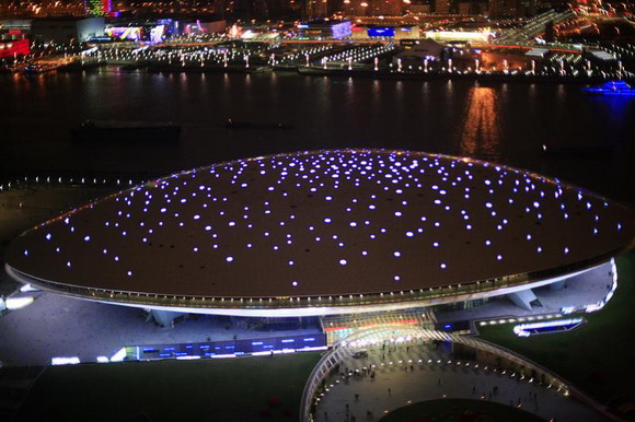 夜幕下的世博演艺中心,像颗颗珍珠,晶莹发亮。