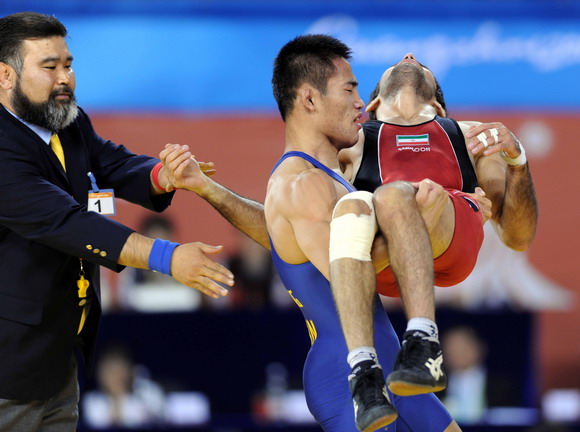 ??2010年11月23日,中国选手高峰(中)抱起受伤的伊朗选手赛义德·艾哈迈迪·扎林科拉伊离场。当日,在第16届亚运会