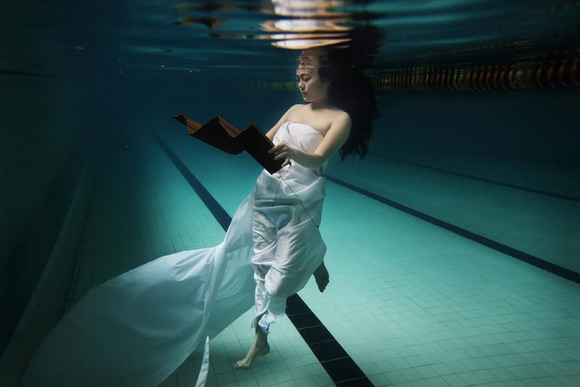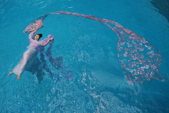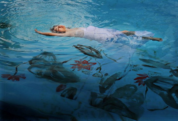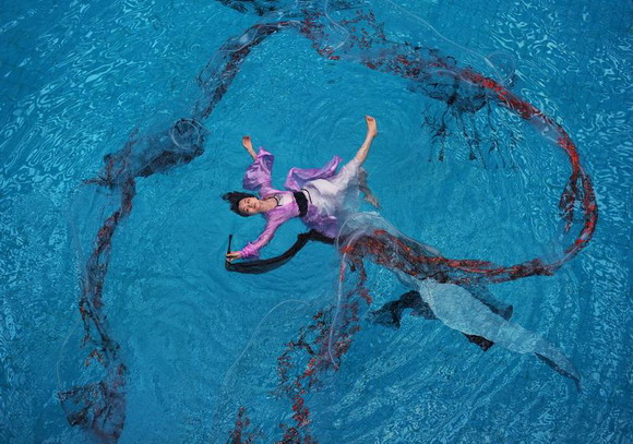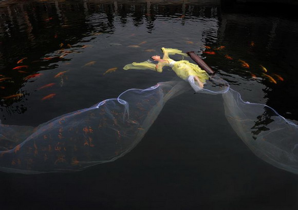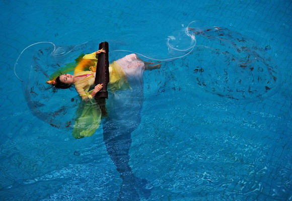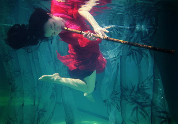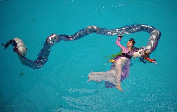 2010年10月20日,中国武汉市,武汉女子彭子轩悬浮于东湖的鱼池里,与鱼共舞,展示她自创的中国式的水上瑜珈。