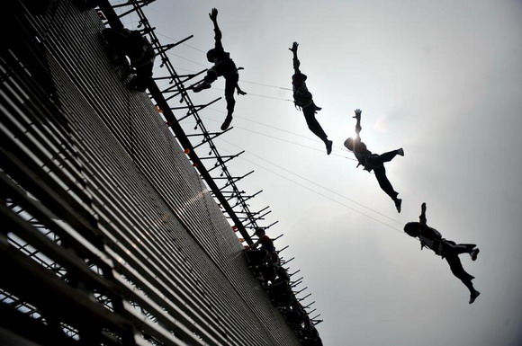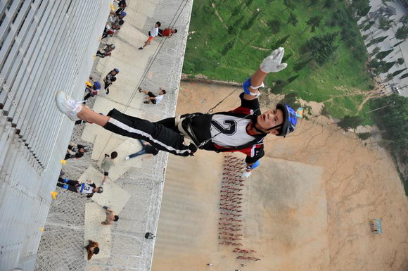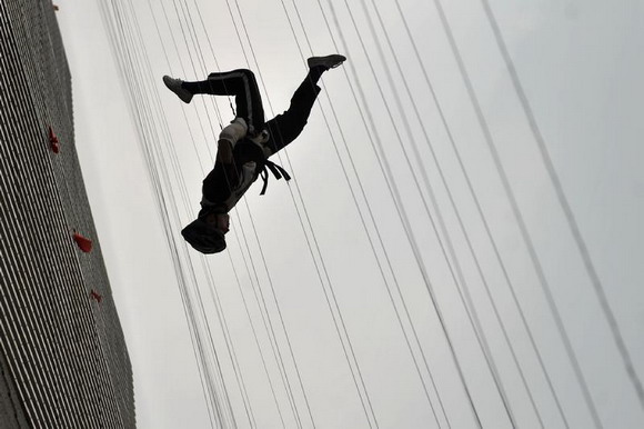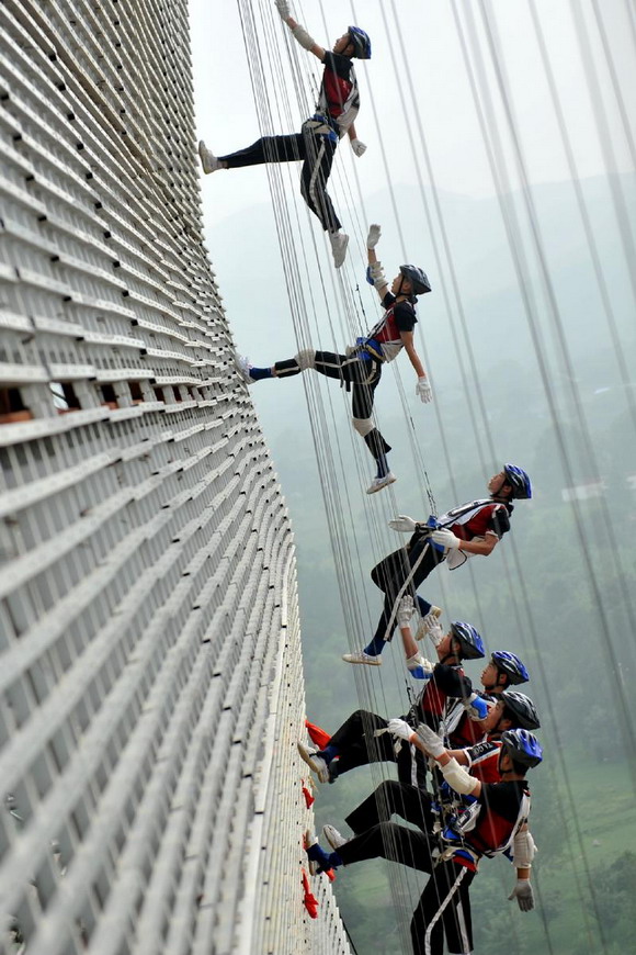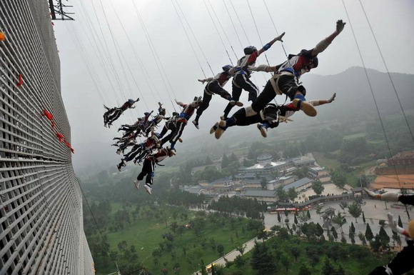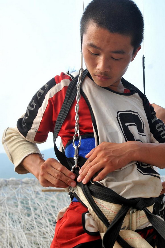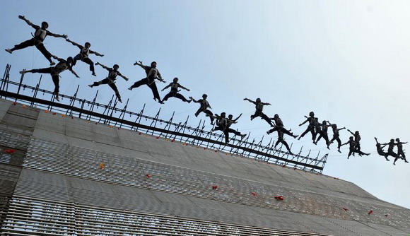 2010年7月29日,河南登封。一群武校学生,在78米的高空飞转,他们在为亚运会开幕式排练“白云之帆”。距离地面78米,仰头就是火辣的太阳,他们依靠吊挂在腰间的两根细钢丝发力,在空中做出高难度动作。地面上,两根细钢丝的尾端,牢牢抓在7名队友手里。这是2010年亚运会开幕式一个重头节目的训练现场。导演说,这个节目表演成功了,点火仪式成功了,亚运会开幕式也就成功了。