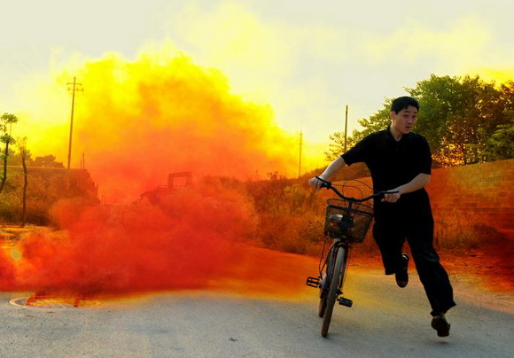 远处的低空已经被染黄。民警和消防员在各个路口设置警戒带, 阻止路人靠近。下风口的“大明铝业”等