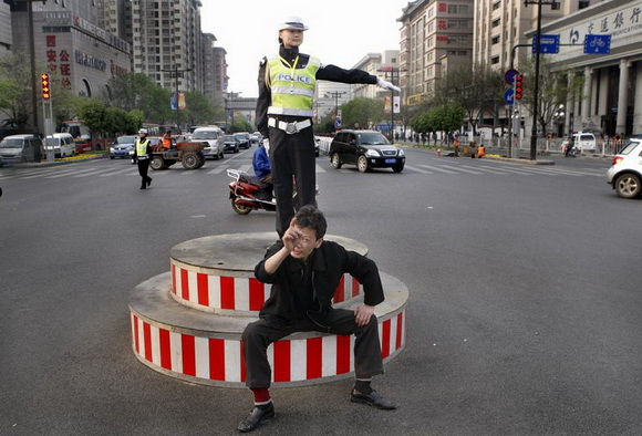 ??? 2010年4月9日下午,在西安市西华门十字,一男子坐在岗台上醉言醉语,岗台上的女警面带微笑照常执勤 。随后,交警莲湖大队的男交警赶来,将男子强行带离。本着人性化执法考虑,因该男子的“纠缠”只是醉酒后无意行为,民警将其批评教育后放人。