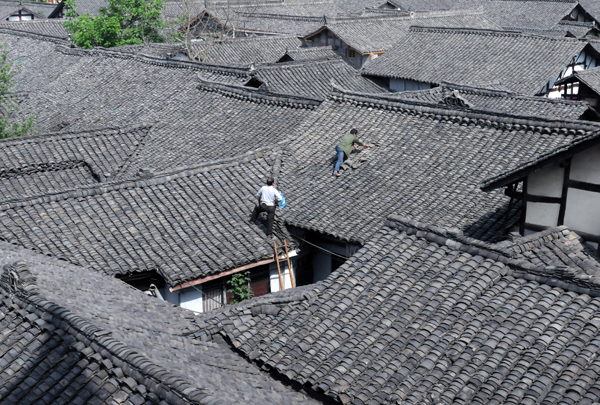 7、工人在修复阆中古城的房顶。