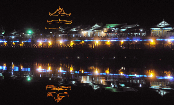 9、夜幕降临,五彩缤纷的阆中古城倒影在嘉陵江的水面上。