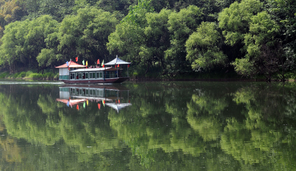 22、游船在构溪河国家级湿地保护区水面上行进,仿佛在绿树中穿行。