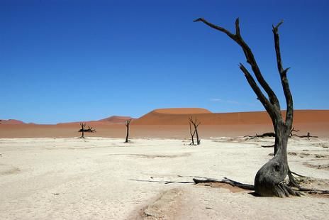 当然,这只是天马行空的想象,科学对此作出的解释要平淡得多。位于纳米布-诺克卢福国家公园里的这片沙岩地形周围耸立着世界上最高的沙丘,大约高达350米;其中一座高近400米的沙丘名叫“大老爸(Big Daddy)”。它的粘土外层可能是在特萨查布河(Tsauchab)流经此地,发生洪水时形成的,骆驼刺在浅水处生长,它们喜欢沙土。接下来的气候变化导致这里发生了翻天覆地的变化。900到1000年前,这里遭遇严重旱灾。沙丘移向这片沙岩,阻断了河流流入死亡谷的必经之路。地下水被消耗一空,树根失去了维系生命的条件,更糟糕的是,这里的常见的降雨也不复存在。树木慢慢死去,变干,毒辣的阳光将其烤焦,使它们的外表变黑。沙丘变成橙红色,看起来像生锈了一样。