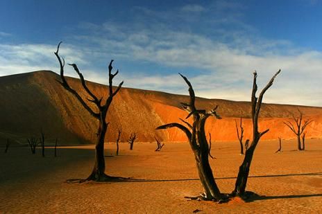 树木慢慢死去,变干,毒辣的阳光将其烤焦,使它们的外表变黑。沙丘变成橙红色,看起来像生锈了一样