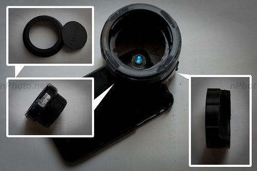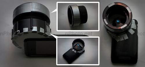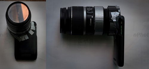 关于iPhone的创意配件和创意软件我们也见了不少,即便是在iPhone的摄像头上作文章的附件我们也见识了不少,不过你肯定没有见过今天这么牛的一位。通过特殊的自制转接环,将佳能数码单反镜头 EF-S 18-50mm 转接到iPhone上,从而实现真正的光学变焦。下面我们还是来一起看这个神器是怎么做出来的吧。