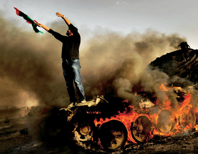艾季达比耶被攻陷后,我迅速赶往当地。起义军占领了那儿,群众开始狂欢,朝天鸣枪??ㄔ朴祷ふ叩氖灞榈囟际牵孀湃胀芳蜕⒎⒊龈艿囊煳?。坦克上燃烧着熊熊大火,我很担心它随时会发生爆炸。突然有一个人跳上了这辆正在燃烧的坦克。我对坦克没有兴趣,但这个人吸引了我。我希望表现出每个人重获新生时的那种喜悦感,而一幅恰好吻合的画面就这样突然出现在我的面前。我尽可能靠近,离坦克只有几米距离,开始狂拍一气。脑中默数到五,立马转身就走。我见到了太多四分五裂的尸体,而我并不想变成那个样子。我来这儿是为了讲述故事,我必须这么做,这是我前往此地的原因,但我并不能让自己太过贪婪。