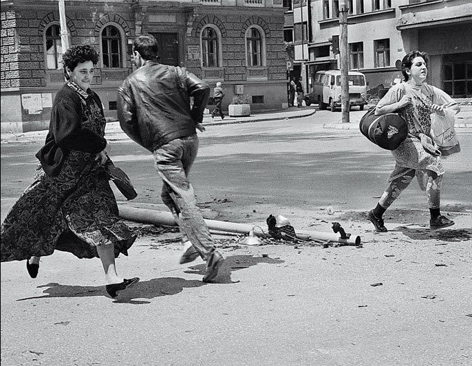 我对战争大片式的作品完全没有兴趣,我在意的是记录人们在战争阴影下的生活。这张照片拍摄于萨拉热窝有名的狙击点,人们想从街道的一边去往另一边只能用跑的,隐藏着的塞尔维亚狙击手随时可能对他们开枪。这条街上每天回响着狙击子弹划破空气的声音,亡魂不计其数。生活在战火下的人们谁敢说自己不害怕,不是在撒谎就是有点傻。你必须寻找到对抗恐惧的方法,你必须表现得非常镇定。你去那儿既不是为了度假也不是为了找刺激,你去那儿是因为感觉到自己的照片也许能让事情出现转机。萨拉热窝是我多年工作经历中最危险的地方。也许我能够离开,但居住在萨拉热窝的人们不能。在萨拉热窝工作最不可思议之处在于它离伦敦很近很近,近到只需要一两个小时你就能站在希斯罗机场的大厅。那里来来往往的人有的打算去滑雪,有的打算去加勒比度假,而你只想仰天长啸,“为什么你们不懂?”。你不过是一个不速之客。