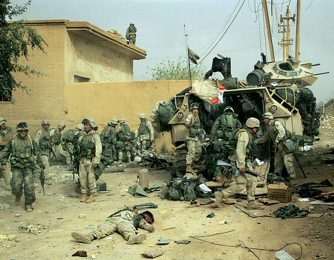 这张照片拍摄于军事行动开始。我们位于迪亚拉桥头,海军陆战队员们必须拿下这个据点才能继续进军巴格达。画面中看到的是先头部队,正是他们拉倒了萨达姆雕像。伊方向我们展开了猛烈的炮火攻击。一波接着一波的开火令人恐慌,这不光因为炮火本身,还因为炮火袭来的场面。有一枚炮弹正中坦克,如果这枚炮弹越过坦克那么一点点,被击中的可能就是我。本能让你想躲起来,但你不能这样做。你去那儿是为了工作,去那儿是为了传递新闻。只要动起来,就能克服恐惧。和平民及士兵们的压力比起来,我的算不了什么。我一直在对自己重复这一点。我来或者不来,他们都别无选择。