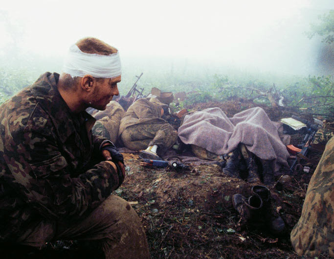 这张照片拍摄于一大清早。头天晚上的激烈交火交火造成四人死亡,十人受伤,我非常害怕。晚上起夜时我发现身边四米远的地方就躺着一名车臣武装分子的尸体。你看过电影,读过小说,能想象这一切。但当你真的面对这些事情时,感觉和电影绝对不一样。我们出发时一共有六十个人,回来时只剩下三十个,几乎个个带伤。我活下来算是幸运。