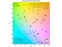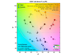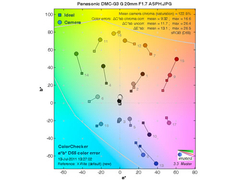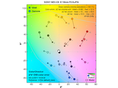 本测试图反映了四款产品配合各自镜头的实际成像色彩值与理想值之间的差异。图中被灰色线包围的部分是所测相机的色域范围,色彩误差图中,Lab色域坐标里的方块表示拍摄对象的理想色彩(标准色彩),圆圈则表示所测试相机的成像色彩。