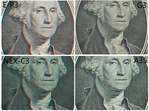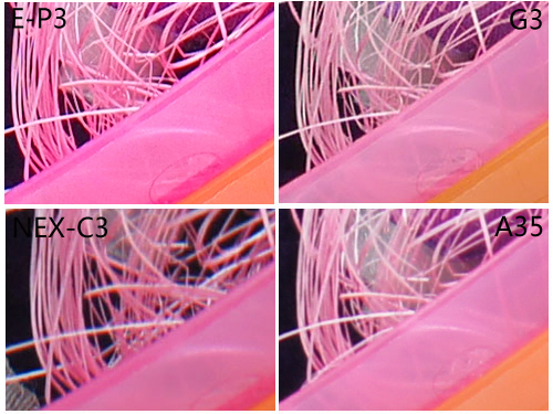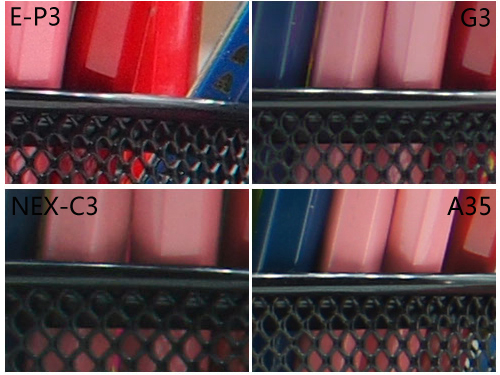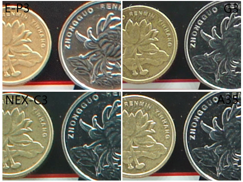 我们分别用E-P3配合了17mm F2.8镜头、G3配合20mm F1.7、NEX-C3配合16mm F2.8、A35配合50mm F1.4拍摄的ISO200档位拍摄实际样本,并对其四个部分进行100%截取,来观察四款单电产品在细节方面的表现。从下面第二部分的截图中可以很明显的看到松下G3对细节的表现了最为出色,而在第三部分的截图中能够观察出,E-P3对画面层次的把握上要更为出色一些,但是其画面成像中存在明显的色散现象。