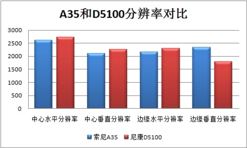 从测试的结果我们可以看到,尼康D5100分辨率成绩要好于索尼A35。尼康D5100中心水平分辨率能够2721。