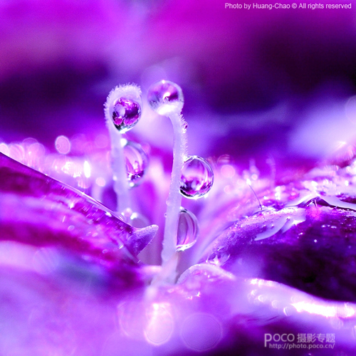 我比较喜欢运用6X6的构图方式。这作品花蕊和水珠是主体,为了突出晶莹的感觉,采用了晴天正午逆光拍摄。在背景色的安排上,放置了相同花色的花朵在画面后部,向上的花蕊相对委婉,体现出了独特雅致的花语。紫色调的色彩基本遵循了花卉本身的色彩,更能营造出梦幻的空间感,花瓣经过洒水,在逆光下也可以拍摄出点点光斑,显得更加梦幻。
