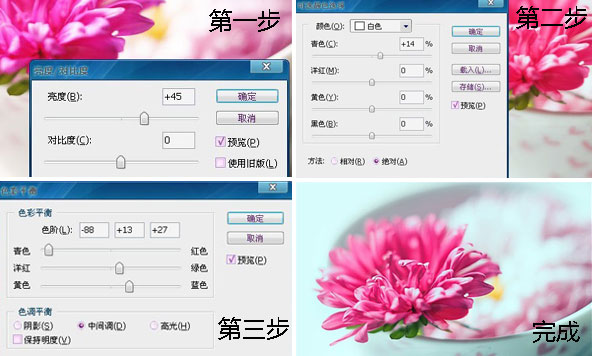 这是我常用的,也是非常简单的方法。首先提升整个画面的亮度,然后选择可选颜色选项中的白色,提升青色选项,让色彩更丰满,最后调整色彩平衡。