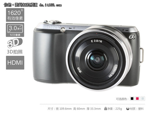 2011年6月发布的NEX-C3是索尼旗下第三款微单数码相机。其最大的优势在于轻薄的机身和时尚的可选色彩,并且还搭载了索尼全新开发的APS-C规格CMOS传感器?;?NEX-C3的机身采用塑料材质(仅机顶为金属材料),手持握感比NEX-5C稍差,但细节做工无可挑剔,其机身大小及厚度与普通卡片相机不相上下。