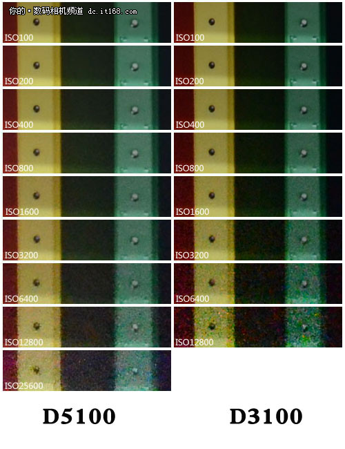 小结:从感光度上来看,在ISO800以下的感光度档位,尼康D5100的表现略优于尼康D3100,而到ISO3200及以上的高感光档位两款产品均出现严重噪点及细节损失。在100%原图下呈现明显色块,因此均不建议使用此档感光度??梢运的峥礑5100相比尼康D5100有半档的优势。