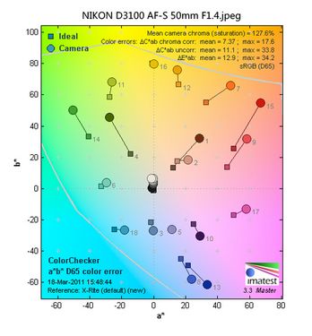 下图反映出了尼康D3100在配合AF-S 50mm F1.4镜头时,其实际成像色彩值与理想值之间的差异。图中被灰色线包围的部分是尼康D3100与AF-S 50mmF1.4的色域范围(超出sRGB色域27.6%),测试图中方色块为理想色彩值,而圆色块为实际拍摄值。