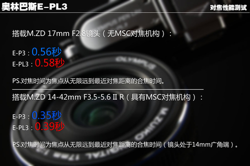 E-PL3号称具有和E-P3一样的FAST AF系统,但奥林巴斯官方并未就其具体技术细节作出如E-P3一样的详细说明,这不免让人怀疑其对焦性能是否能够达到和E-P3一样的水平。于是,我们使用同样的两支镜头,在完全相同的测试环境下对E-P3和E-PL3的对焦速度进行了一次对比。对比结果如下: