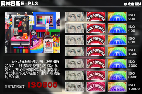 从测试结果看,E-PL3在ISO400及以下的画面锐度及细节表现非常不错,ISO800时的画面出现轻微颗粒感,但锐度和细节几乎没有损失。当感光度达到ISO1600时,颗粒感使得画面细节有所损失,并且此时出现了轻微的色彩漂移问题。从ISO3200开始到ISO12800,E-PL3的画面整体色调开始偏向紫色,且色彩漂移也变得越来越严重,ISO3200下的样本仅适合在桌面尺寸下查看,而ISO6400和ISO12800两档感光度则没有实用价值。