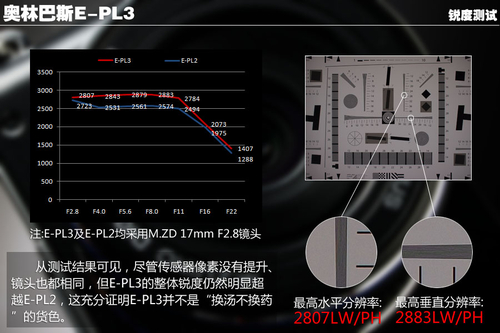 下图反映了E-PL3在配合M.ZD 17mm F2.8镜头时的中心锐度曲线(红色)。其中锐度数值由imatest给出,测试样本为各档光圈下拍摄的ISO12233分辨率标板(为方便比较,锐度曲线中还加入了E-PL2的数据)。