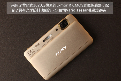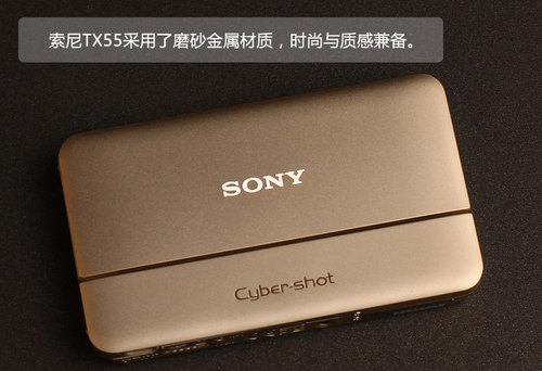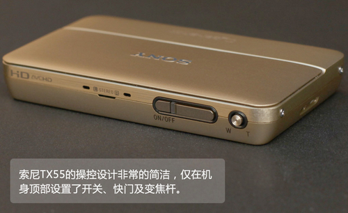 索尼TX55采用了金属磨砂材质,将其拿在手中质感十足。其采用了一枚2.3英寸1620万有效像素的Exmor R CMOS影像传感器,配合了具有光学防抖功能的卡尔蔡司Vario Tessar潜望式镜头。因为索尼TX55采用的一块123万像素3.3英寸触控屏占据了整个机身背部,因此其操控按键设计的相当的简洁,仅在机身顶部设置了开关、快门及变焦杆,其它操作均通过触控屏来完成。在电池方面,TX55采用了一枚630mAh可充电锂离子电池。在存储卡方面,同时支持索尼自家的M2存储卡及Micro SD存储卡。