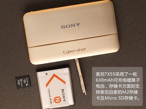 ▲索尼TX55采用了一枚630mAh锂离子充电电池,支持M2/Micro SD存储卡