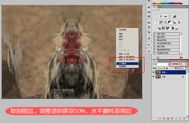 打开原图,按Ctrl+J复制一层,把新图层透明度调到50%??旖菁麮trl+T进入变换命令,然后点击右键,进行“水平翻转”,这样就能方便的看到重叠的图像。