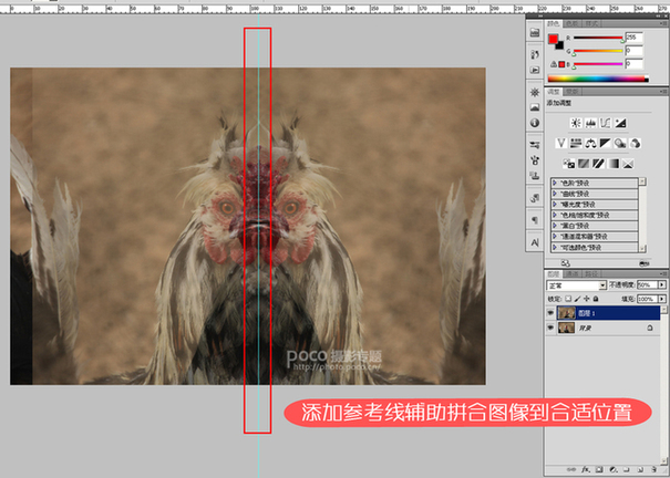 在重叠图像的中间添加参考线(使用移动工具从左边的标尺中拖出即可),辅助拼合图像,使用移动工具“V”将图片左右拖动,直到自己喜欢的位置。