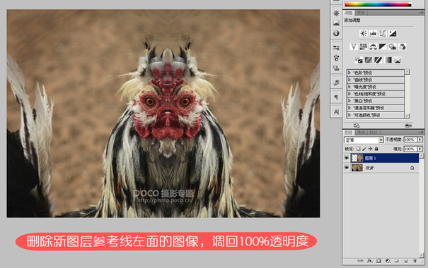 把图层透明度调回100%,使用矩形选框工具“M”选择参考线左边的所有图像,并按“Delete”键删除所选图像。然后使用快捷键CTRL+H隐藏参考线,现在已经基本能看到最后效果了。